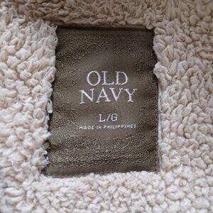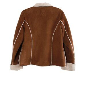 A cozy faux shearling jacket in a warm chestnut brown. Soft exterior with plush sherpa lining; non-stretch fabric. Perfect for fall and early winter. Note: Light dye rub from darker garments - see last photo, most noticeable on the inside hemline and sleeve cuffs but does not affect exterior appearance. Pre-loved condition, still in great shape, with minors signs of wear.
