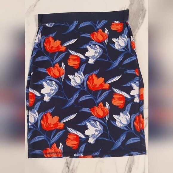 Make a bold yet feminine statement in this Old Navy Floral Print Pencil Skirt. Featuring a gorgeous navy blue base with striking red and white/cream tulips, this knee length skirt is perfect for spring & summer styling. Its form-fitting yet stretchy design makes it a versatile staple—ideal for dressing up with a blouse & heels or going casual with sneakers & a cropped tee!