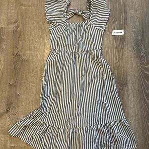 Sweet and comfortable, this Old Navy girls’ dress features a floral print in shades of pink, white, and cream set against a navy blue background. Perfect for spring, summer, or special occasions, it’s lightweight and easy to wear.