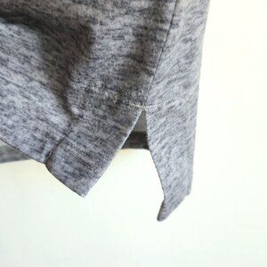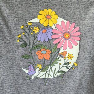 A lovely and super-soft sleep top from Old Navy, perfect for a cozy night's sleep or lounging around! Gray heathered knit fabric with a bright, whimsical graphic print featuring a white crescent moon, a cluster of colourful flowers (pink, yellow, orange, purple) and some cute mushrooms. Crew neck, short sleeves, and a straight, relaxed cut with small slits on the side hem.
