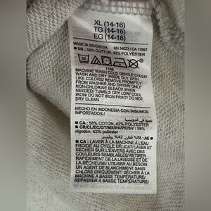 Old Navy: Girls Graphic Long Sleeve Top- Size XL. Previously owned & lightly used. This top was washed & worn a few times. There is some slight pilling & fading. Design on front of shirt has some wear as pictured in photos #2-3 - it appears the design has rubbed off in several areas. Great for layering. Last two photos are of the top posed inside out. Made of 58% Cotton 42% Polyester.