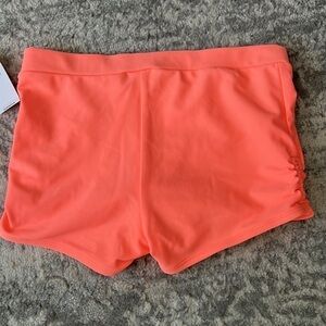 Swim shorts. Fitted through waist and hip, ruched at sides, full coverage.