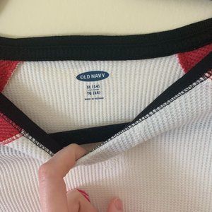 This super cute longe sleeve baseball tee has never been worn before! It’s made of a cozy thermal material and has an adorable sunset coloured graphic on it. It’s labelled as a kid's size XL but can fit a woman’s size XS as well.