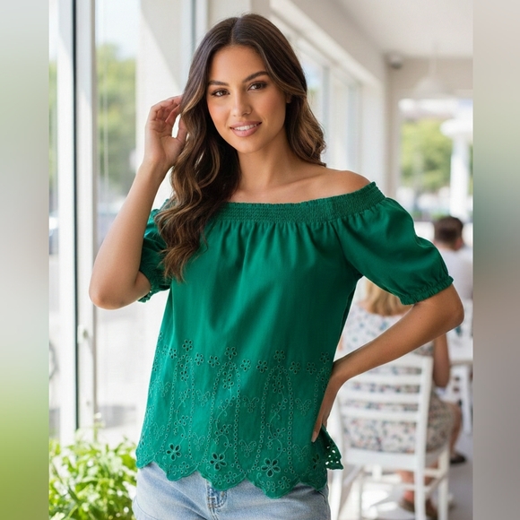 Super cute vibrant green off shoulder eyelet top from Old Navy