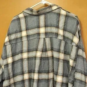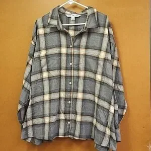 New with tags, no flaws seen. Lovely, grey, black, white and tan plaid, button down shirt with collar and 2 front chest pockets. Boyfriend style cut. 100% cotton. Soft and cozy. Perfect for fall. Size 2X and 3X available.