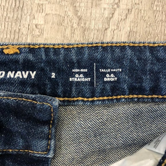 Old Navy high rise OG straight jean short, size 2, in a medium blue. In excellent condition; barely worn. Frayed detail; distressing on one side. Pet-free, smoke-free home.