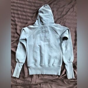 Teal coloured hoodie, longer arm length and body length. From fall 2007.