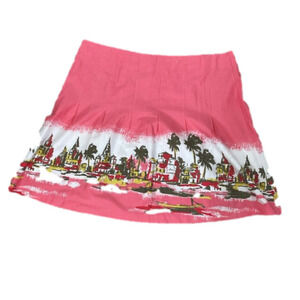 DESCRIPTION: The perfect Summery fun skirt! A line that sits just below the waist with a city scape print. Lightweight. Pretty in pink!