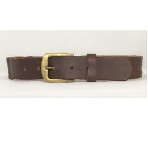 Leather belt has strips, 'antique brass' buckle and trim. 1.5" wide. Fits 21.75" to 25.75" waist. Excellent condition.