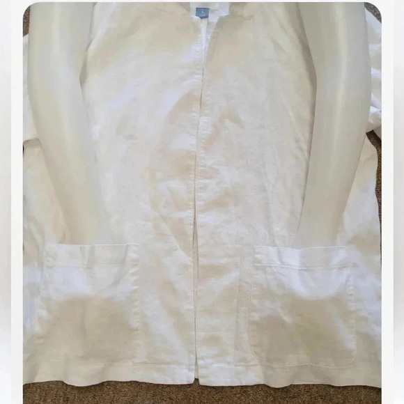 Snow white in color, this open blazer is a linen blend. It features two pockets and long sleeves.