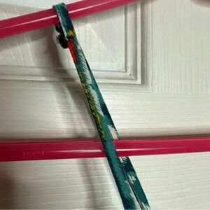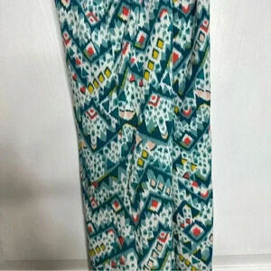 Green, white, yellow, and red in colour with fun abstract pattern.