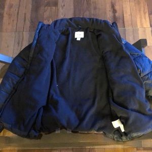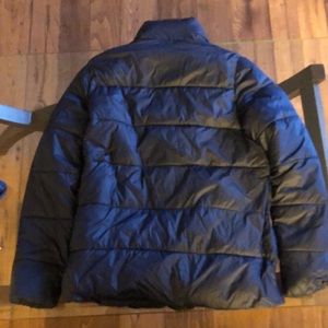 Old Navy, medium, navy blue puffer jacket. Fleece lined with nylon shell. Good for cooler fall/winter temperatures. Two front pockets with snaps. No hood design. Excellent condition, no flaws.