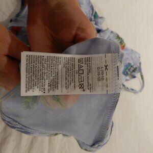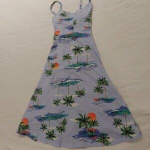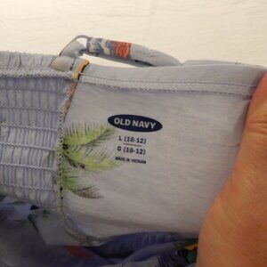 This is a brand new, never worn Old Navy girl's cotton summer dress in a size L (10-12). It has adjustable straps, a flared skirt, and a smocked back for a good fit. It features a tropical print of a palm covered island on a pale blue background.