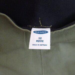 Nice pants for office or for a nice outing in the city. Old Navy. NEVER WORN, The right color is on the first picture. It's a nice olive colour. False pocket at back. Would be ankle length for a woman of 5ft and 5ft4. Machine washable, tumble dry low. 97% cotton and 3% elastane. Side zipper.
