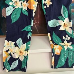 Chic cropped pants with floral design. Navy base with yellow and green flowers. Ideal for casual wear.