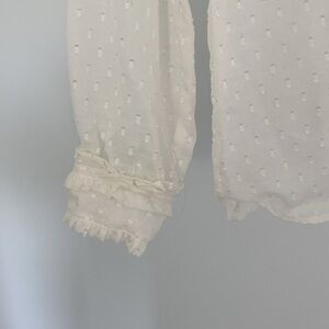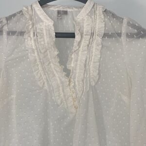 Pretty off white textured see through lightweight blouse with ruffles at the V Neck line and cuffs. Pullover breezy style.