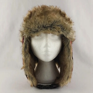 Old Navy Red Black Cherckered Trapper Winter Hat Faux Fur Size L - XL
