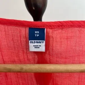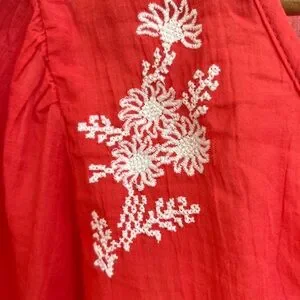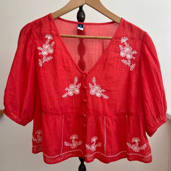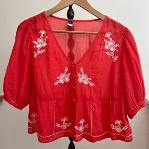 Old Navy women's blouse in a bright pinky red hue. V-neck with button-front detail. White floral embroidery accents front and hem. Short puff sleeves and a relaxed peplum silhouette. Lightweight, breezy fabric for easy wear.