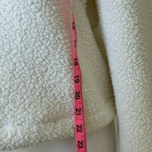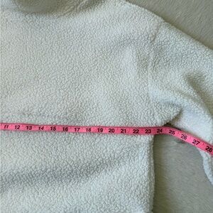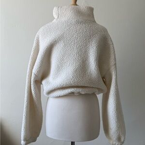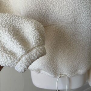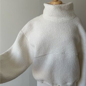 Super soft Old Navy sherpa fleece pullover in a crisp ivory/cream shade. Features a cozy mock neck, plush teddy texture, and adjustable drawstring hem for a flattering cropped fit.