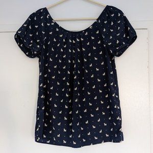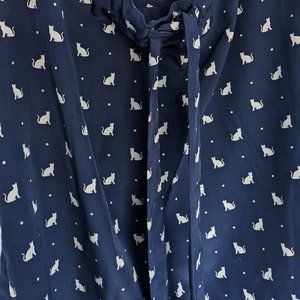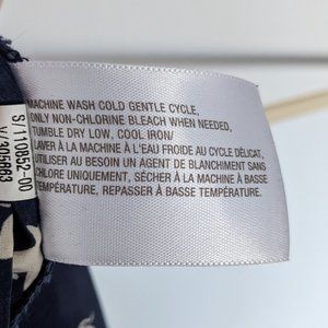 No size tag but it fits small to medium. Measures about 18" across the chest. Two long ties at the back of the neck can be tied into a bow, or if you want to wear the whole shirt backwards, it also looks really cute with the ties on the front.