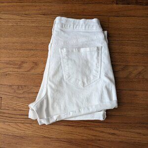 White denim shorts have rolled bottom edge, lower rise. Worn once, then washed. Small amount of stretch.