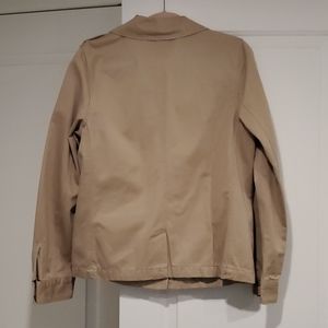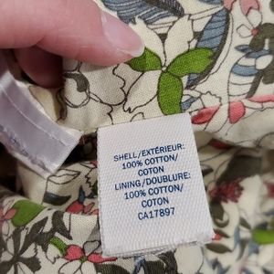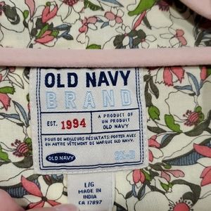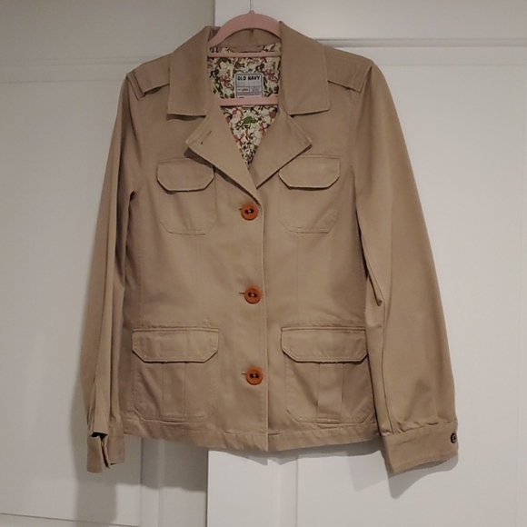 Great spring jacket with pretty flowered lining from Old Navy, size large. Jacket sits at hip with distressed details.
