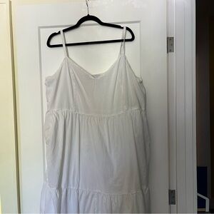 lovely well constructed piece. cotton rayon blend. lined. easy, and very pretty. size xxl. adjustable straps. approximate flat measurements:
