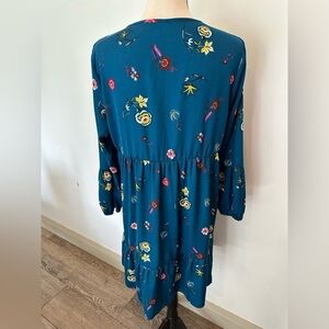 Old Navy Turquoise MIDI Dress Long Sleeve Floral Pattern Velvet Trim SZ M