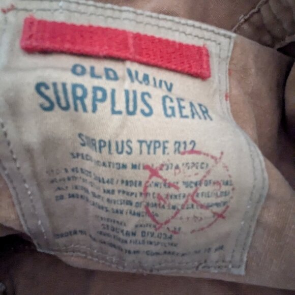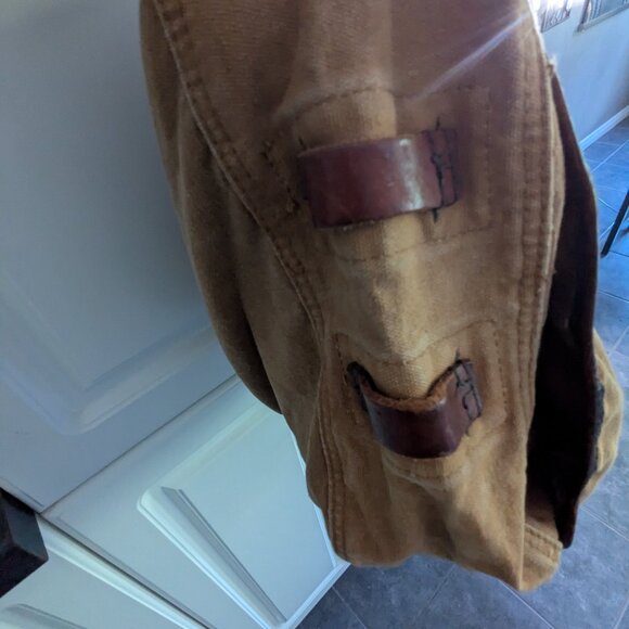 Very large. 50.5 cm wide X 31 cm high. 100% cotton. Caramel color. Worn style. Adjustable straps and a brown handle. 2 snaps at the front connected to 2 leather straps. The edge of the bag is in dark brown leather. A small zip pocket on the side. No pockets inside.