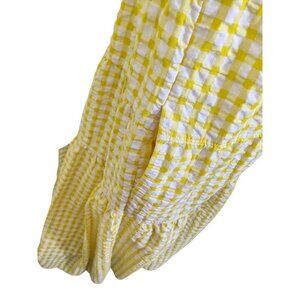 The Old Navy Women's M Fit Flare Tiered Seersucker All Day Yellow Gingham Maxi Dress is a stylish and versatile piece perfect for various occasions, from picnics to parties. Made from a comfortable cotton blend fabric, this long dress features a flattering V-neck and short cap sleeves with a tie back accent. The vibrant yellow gingham pattern adds a fun and girly touch, while the smocked back detail gives it a comfortable fit with bohemian and peasant charm. Ideal for summer, fall, or spring, this dress is a classic and feminine choice for any fashion-forward woman. It has pockets!