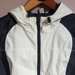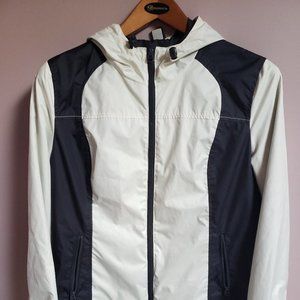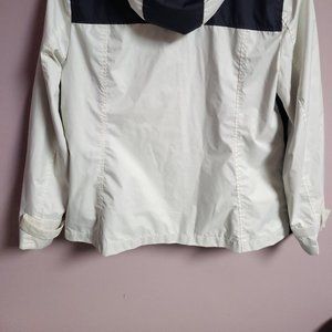 Old Navy Women's Midi Size Large Windbreaker - Pre-Owned. The sleeves are 18in long. It is hooded and cannot be removed. The jacket is white and navy blue. There is a little mark on the jacket. The height of the jacket is 26in. If you have any questions, message me. I'll be glad to get back to you.