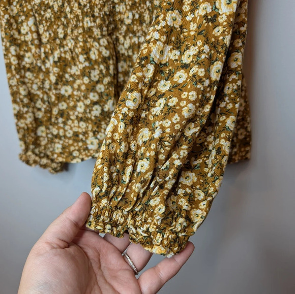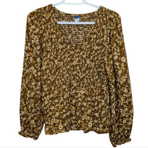 Old Navy Yellow Floral Smocked Long-Sleeve V-Neck Blouse Women Large