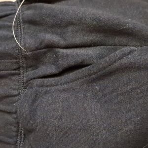 Old Navy dark blue jogging pants, stitching criss cross pattern on the knees, elastic waist, tie on the front sewn in place, they have pockets on the front