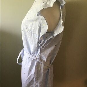 Pretty summer dress with subtle powder blue & white pin-stripes and small flowers. Ruffled at the top of the sleeves (sleeveless). Removable matching tie-up belt. 100% cotton. Very light and breezy feeling. See photos for length measurements.