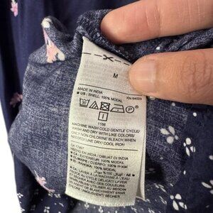An Old Navy Button-Front Mixed-Print Poet Blouse. Features a split V-neck with a banded collar, and Long blouson sleeves with elasticized cuffs. Includes button fastening, seaming with shirring along the front and back, and a skirted hem. Made from soft fabric, featuring a mixed paisley and floral print in navy, with contrasting print piping throughout.