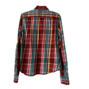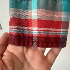 Plaid in colours of teal, purple, yellow, rust, etc.