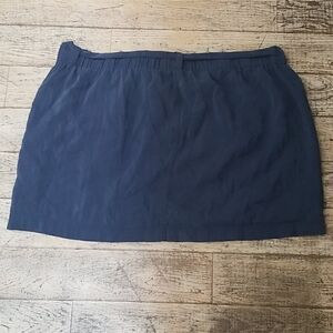 Super soft Old Navy short skirt in navy blue with large pockets on front. Elasticized waist with tie belt and flat front. Fully line good used condition small flaw on belt, unnoticeable when tied, see photos. Also fits size 16 to 18.