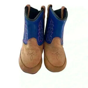 Infant's Old West Poppets Cowboy Boots genuine leather uppers with Tan Foot and Blue shaft. Natural rubber sole for grip walk Soft comfortable lining Velcro closure Color: Tan/Blue