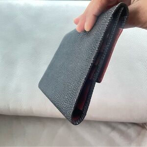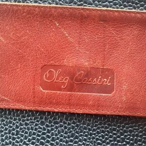 The Oleg Cassini wallet combines a sleek black pebbled texture with a smooth cognac band, offering a stylish and practical accessory for any occasion. Its classic rectangular fold-over design ensures both elegance and functionality.
