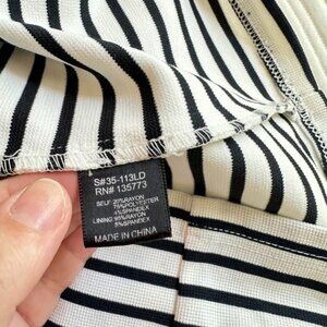 Stunning figure-hugging knee-length dress with no sleeves, deep v-neck, and navy blue stripes on white background