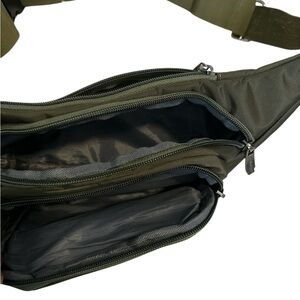 Durable olive green fanny pack. Multiple zippered compartments. Adjustable strap. Perfect for everyday use.