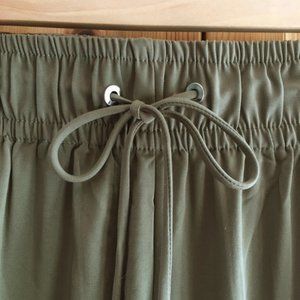 Elasticized waist with adjustable draw string, side pockets and cinched ankle cuffs. Tapered leg, relaxed fit. Long length. Worn once.