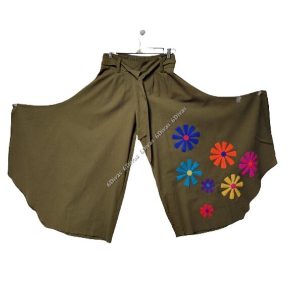 Olive Green Pants Culottes Wide Leg Colorful Floral Embroidered Appliques