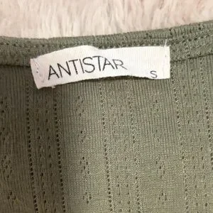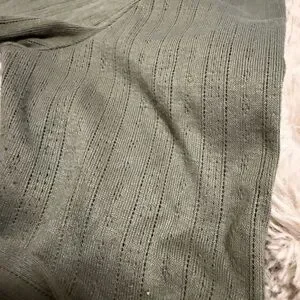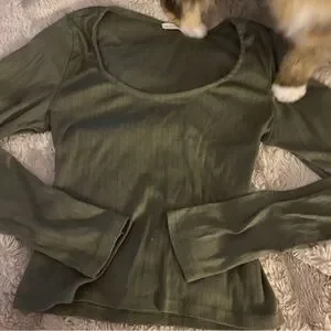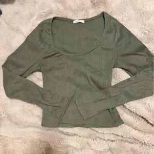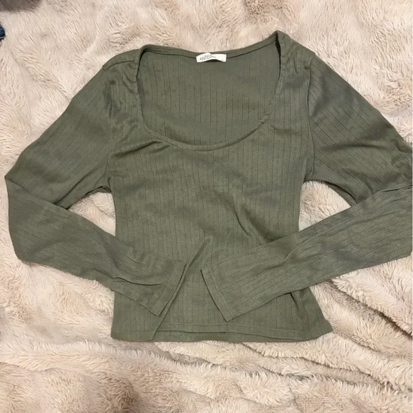 Stylish olive green ribbed knit top with a unique neckline. Perfect for casual wear.