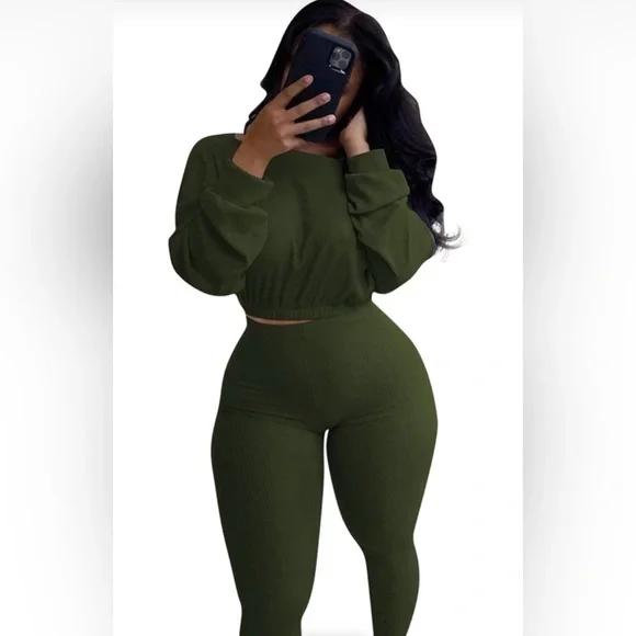 Stylish olive green ribbed two-piece set. Features a long-sleeve top and matching pants. Perfect for casual outings.