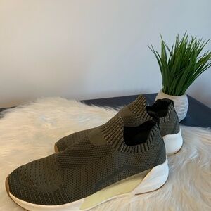 Stylish olive green slip-on sneakers. Comfortable and versatile for everyday wear.