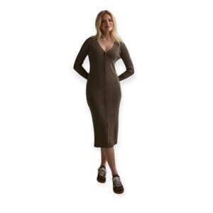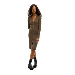 Olive Khaki Button-Up Dress Ribbed Cardigan