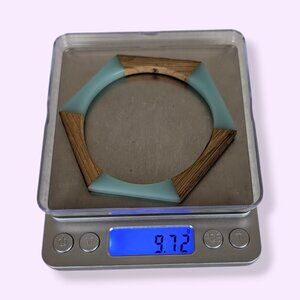 This bracelet by Olive & Poppy is made of reclaimed wood, accented by blue lucite. There is a small maker's mark burned into the interior of the bangle and though it is difficult to read, a bit of research helped me discover the maker. The bracelet has normal wear, and there are no issues affecting wearability.