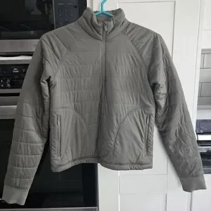 Stylish olive quilted jacket with zip closure. Features side pockets and a high collar for added warmth.