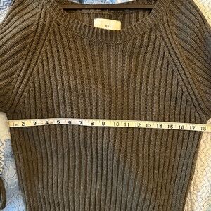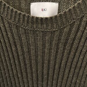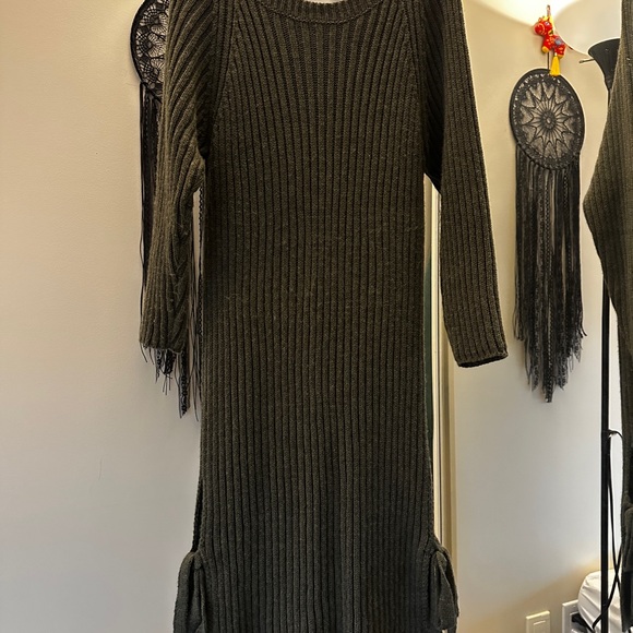 Stylish dark olive green ribbed knit dress with long sleeves. Perfect for any occasion.